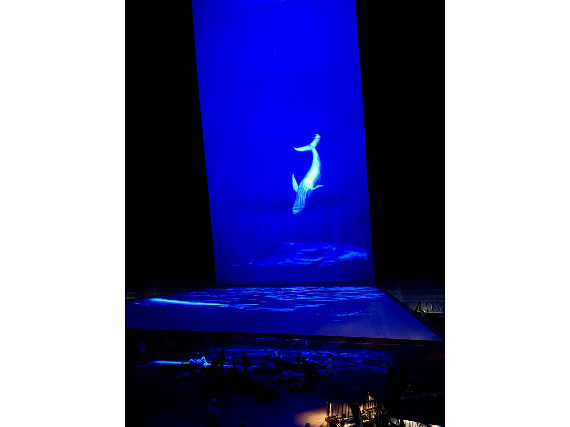 Im über 100 Meter hohen Luftraum des Gasometers führt mich die Inszenierung „Die Welle“ anschließend auch visuell in die Tiefen der Ozeane: Auf einer 40 Meter hohen Leinwand erscheinen Wale und andere Meeresbewohner in lebensgroßen Projektionen. In Kombination mit dem Sound der Tiefe entsteht ein intensives Erlebnis für die Sinne.