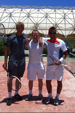 Frank Fahrenhorst und Daniel Kreutzer mit Schmidi im Robinson Club Esqiunzo Playa auf Fuerteventura beim Tennis 2015